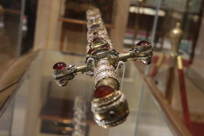 Мы заходим в музей дворца Абдина. Там их даже несколько: музей оружия, подарков Мубараку, орденов и медалей. Вот, кстати, меч, который использовали при коронации в Российской империи, как пишет табличка. На богато украшенных ножнах мне подмигивает усатый Петр I. Приходится поверить в легенду.