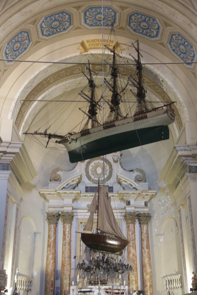 Капелла святого Эразма, покровительствующая морякам. Надеюсь, что яхтсмены заходят сюда помолиться о попутном ветре. Под потолком висят модели кораблей, прямо как в пионерском клубе моделистов.